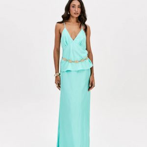 A refreshing aqua green two-piece set featuring a tailored sleeveless top and coordinating fluid midi skirt.
