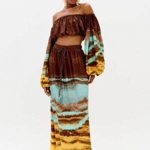 A romantic two-piece set featuring a printed brown strapless crop top and a coordinating high-volume full skirt.