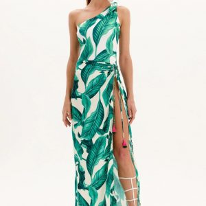 A refreshing tropical-inspired set featuring a minimalist top and a coordinating skirt cover-up with a bold leaf print.