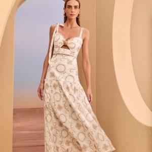 A high-fashion cream set featuring a sculptural cut-out halter bodysuit and a coordinating body-hugging mini skirt with side draping.