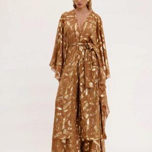 A luxurious caramel-toned two-piece set featuring a relaxed kimono-style wrap top and coordinating wide-leg pants.