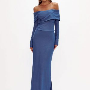 A stunning two-piece azure blue set featuring a sleek strapless top and a high-waisted midi skirt for a statuesque silhouette.