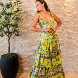 A vibrant yellow set featuring a structured crossover bust top and a graceful flowing tiered skirt.