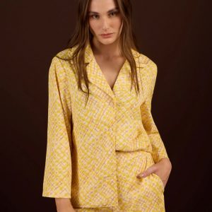 A vibrant yellow shorts and shirt set featuring a unique photo-art print on the back of the shirt.