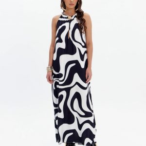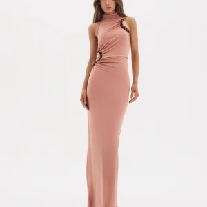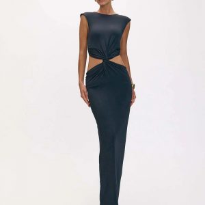 A sophisticated high-neck maxi dress featuring strategic side cut-outs and a statuesque floor-length silhouette.