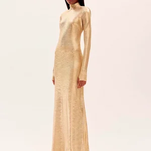 A timeless long-sleeve maxi dress in subtle-shine fabric featuring a high neckline and a daring open-back detail.