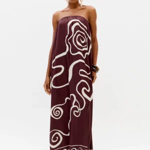 A sophisticated chocolate brown maxi dress featuring an elongated floor-length silhouette and a refined sleeveless construction.