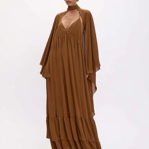 An ethereal brown maxi dress featuring an integrated cape and dramatic ruffled layers for theatrical movement.