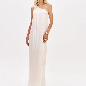 A statuesque pristine white one-shoulder maxi dress featuring a fluid floor-length silhouette.