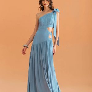 A statuesque azure blue one-shoulder maxi dress featuring a fluid floor-length silhouette.