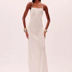 A statuesque white maxi dress featuring a fluid floor-length silhouette and a modern minimalist design.