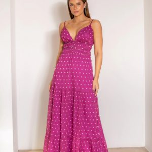 A vibrant fuchsia floor-length dress featuring a classic polka dot motif and a graceful fluid silhouette.