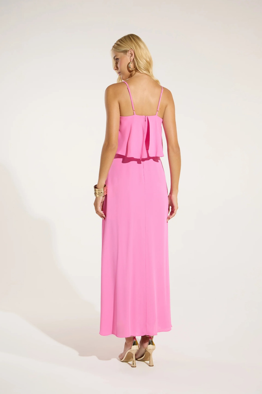 Description: Experience the lightness and elegance of this pink maxi–midi dress. Crafted from fluid viscose crepe it offers a soft touch and a luxurious drape that moves gracefully with the body. The piece features thin adjustable straps for a precise and comfortable fit at the shoulders ensuring both effortless style and ease of wear for any occasion. Its clean silhouette and vibrant pink hue make it a timeless choice for summer evenings or garden events.