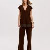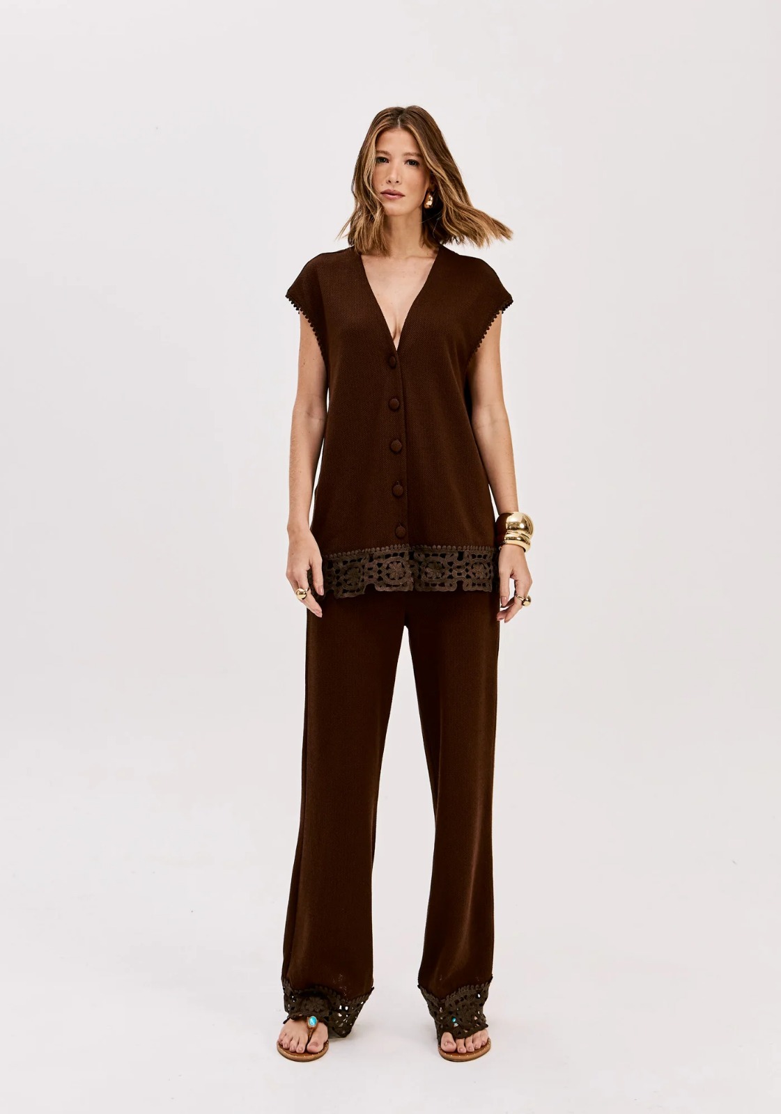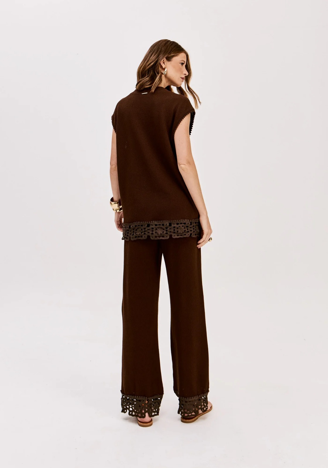 Description: Experience the peak of artisanal elegance with this espresso brown cordset. This ensemble is defined by its deep, earthy hue and delicate lace inserts that add a touch of romantic texture to the modern silhouette. The set consists of a refined sleeveless top and matching tailored trousers, both featuring strategic lace accents that highlight the craftsmanship of the design. Crafted from a premium fabric with a soft-touch finish, it ensures all-day comfort while providing a high-fashion edge. Ideal for autumnal social events or upscale evening gatherings where unique, detailed textures are appreciated.